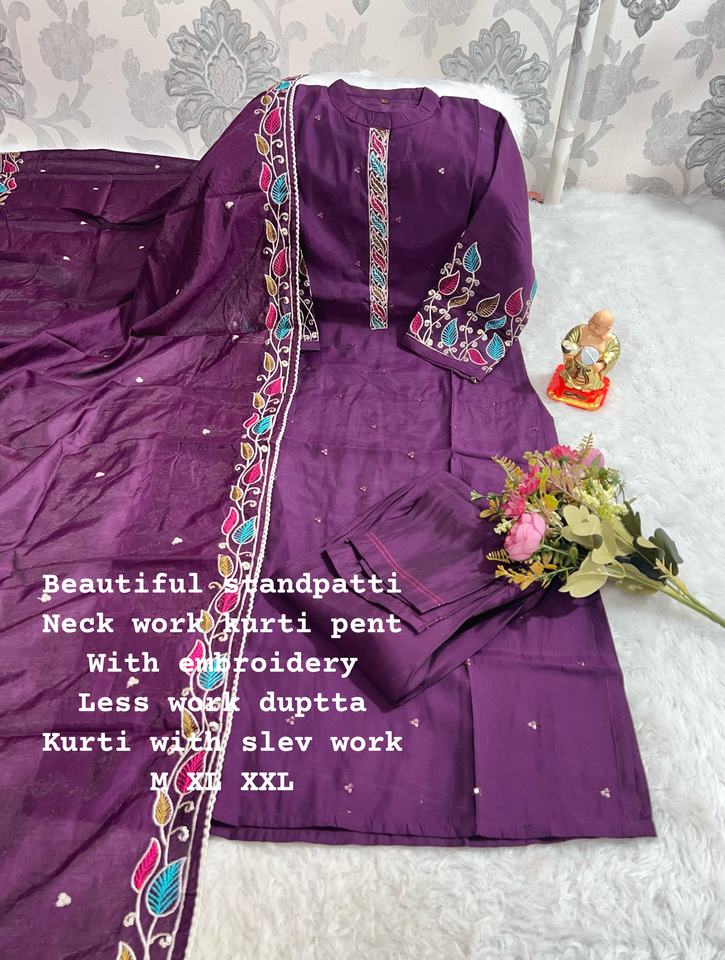 Nombre del producto:Venta caliente de seda de muselina pesada con bordado Kurti Pant y Dupatta