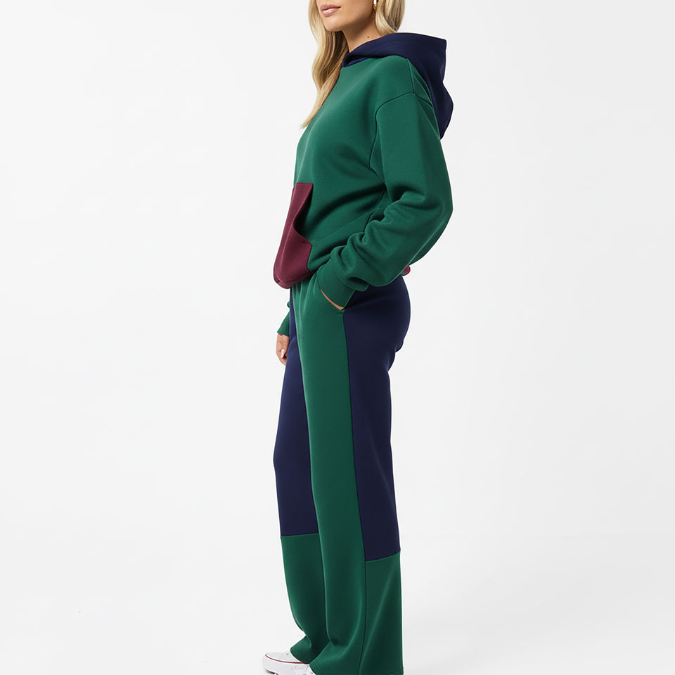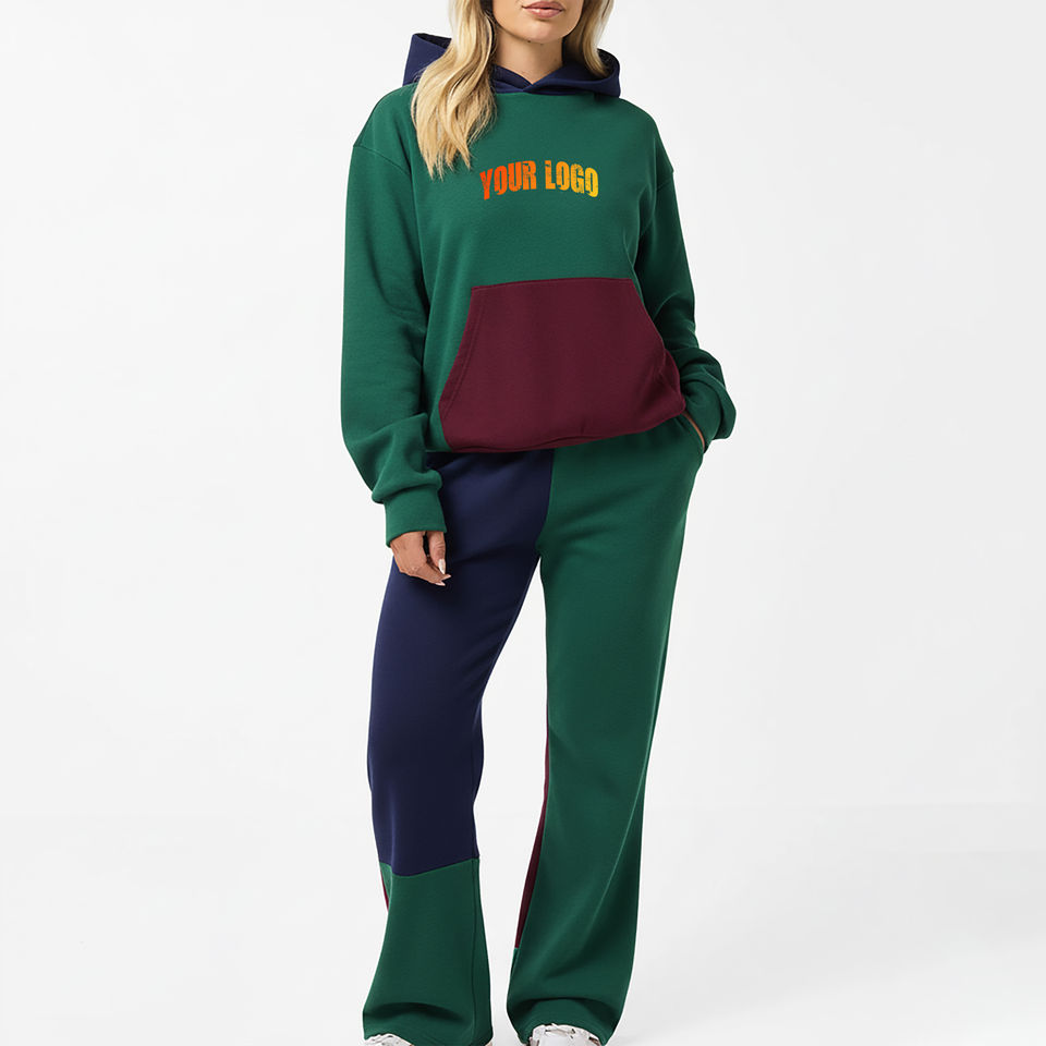 Chándal de Mujer de Alta Calidad, Personalizado con Logotipo Impreso en 3D, Estilo Holgado, Color Sólido, Bloques de Color Invernales, 100% Algodón, Hombros Caídos