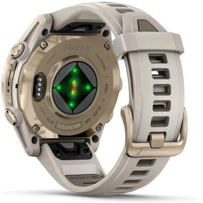 Reloj Garmin Fenix 8 de Alta Calidad, 43 mm, AMOLED, Cristal de Zafiro, Correa de Silicona Color Gris Arena Dorado Suave, Paquete Completo