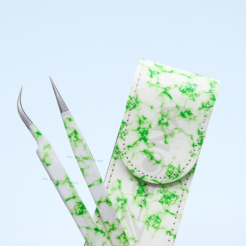 Pinzas de color mármol verde y blanco de alta calidad, extensiones de pestañas, pinzas de aislamiento de etiqueta privada personalizadas con estuche