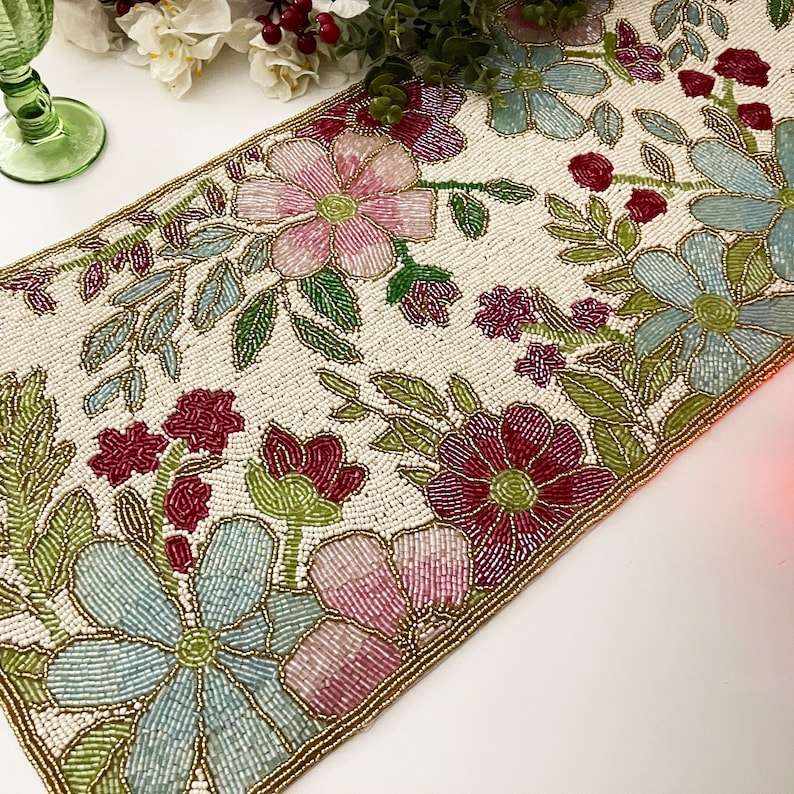Camino de Mesa de Flores con Cuentas Hecho a Mano de Alta Calidad, Mantel para Cocina y Comedor, Camino de Mesa con Cuentas Artesanal de 36 Pulgadas