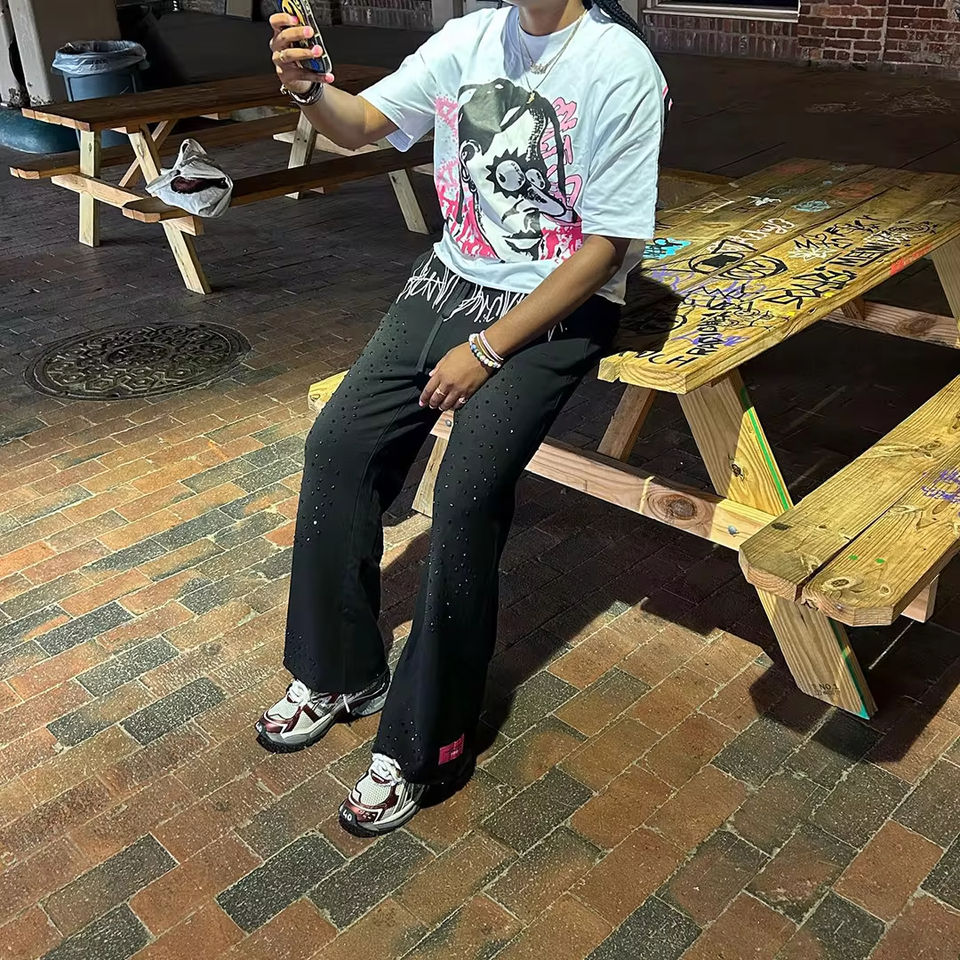 Pantalones de chándal acampanados de lana pesados personalizados para hombre de alta calidad, pantalones de chándal de algodón con estampado total en todas partes