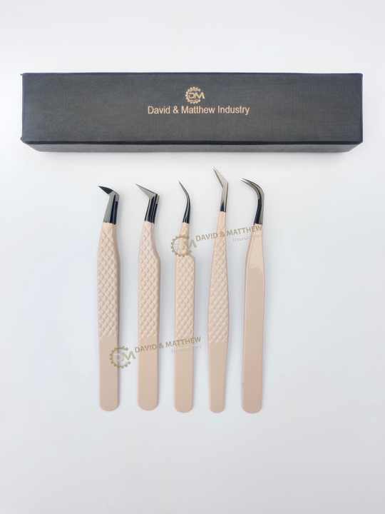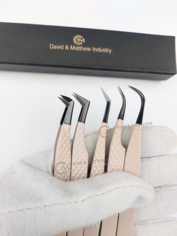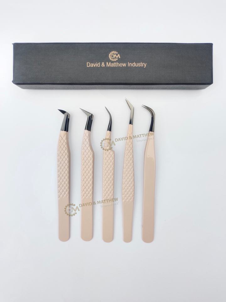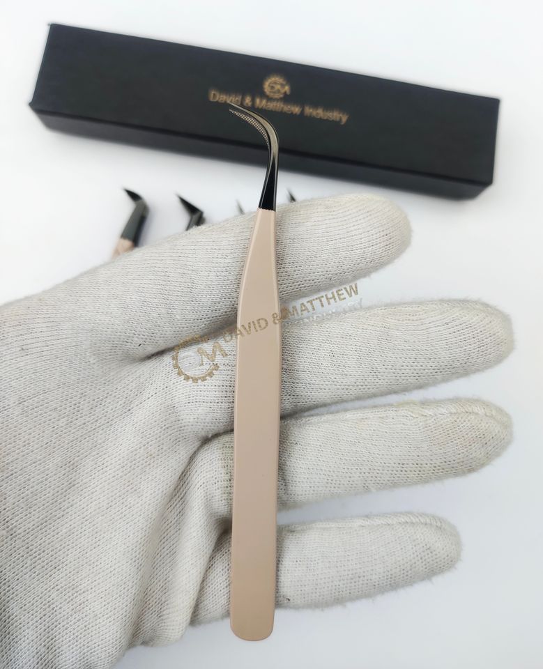 Pinzas para Pestañas Reutilizables de Acero Inoxidable Beige de Primera Calidad con Agarre de Diamante, Puntas Puntiagudas/Redondeadas, Marca Privada Personalizada