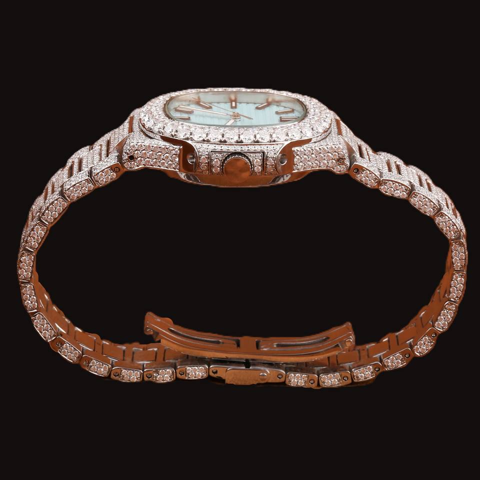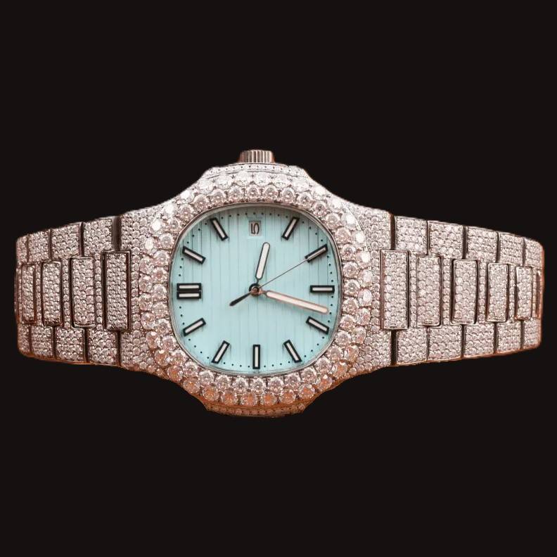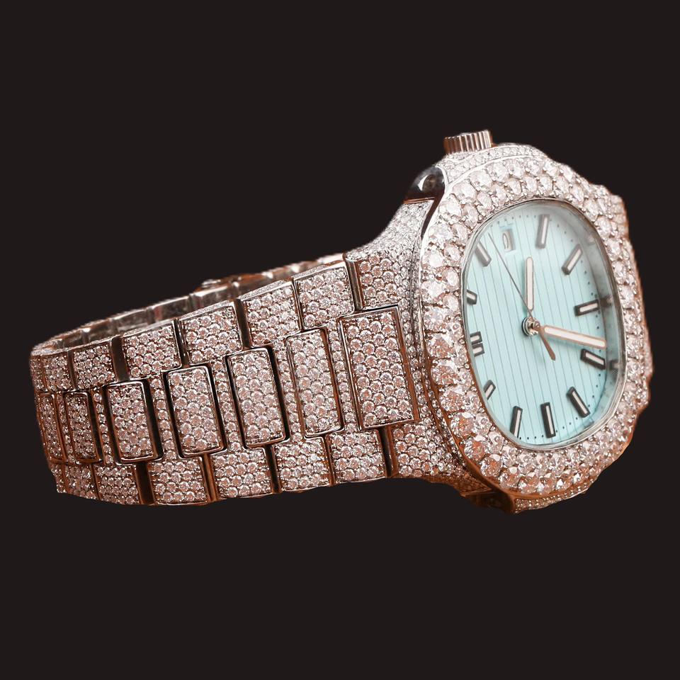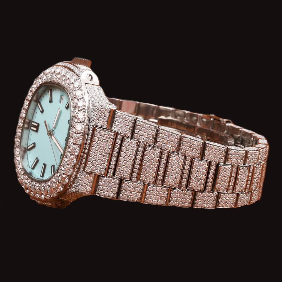 Reloj de Lujo con Incrustaciones de Diamantes Moissanite, Esfera Cuadrada Azul Cielo, Chapado en Oro Blanco, Estilo Hip Hop, Hecho a Mano