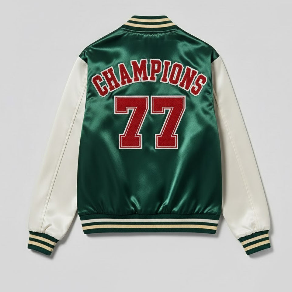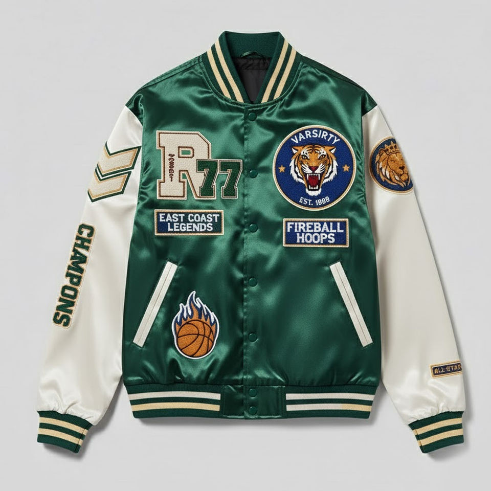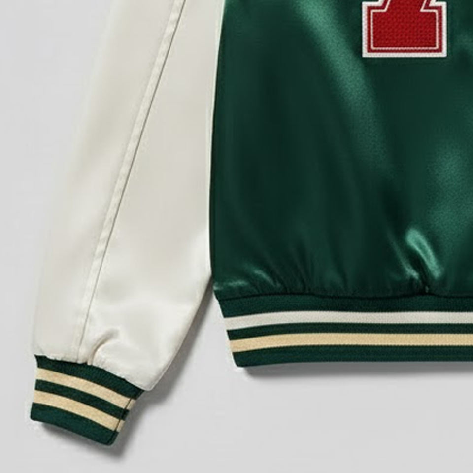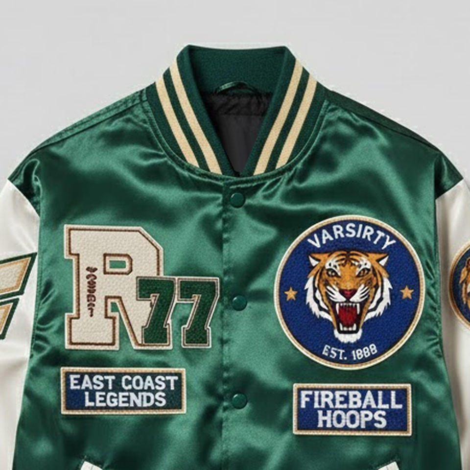 Nombre del Producto:Chaqueta universitaria de satén con bordado de chenilla para hombre