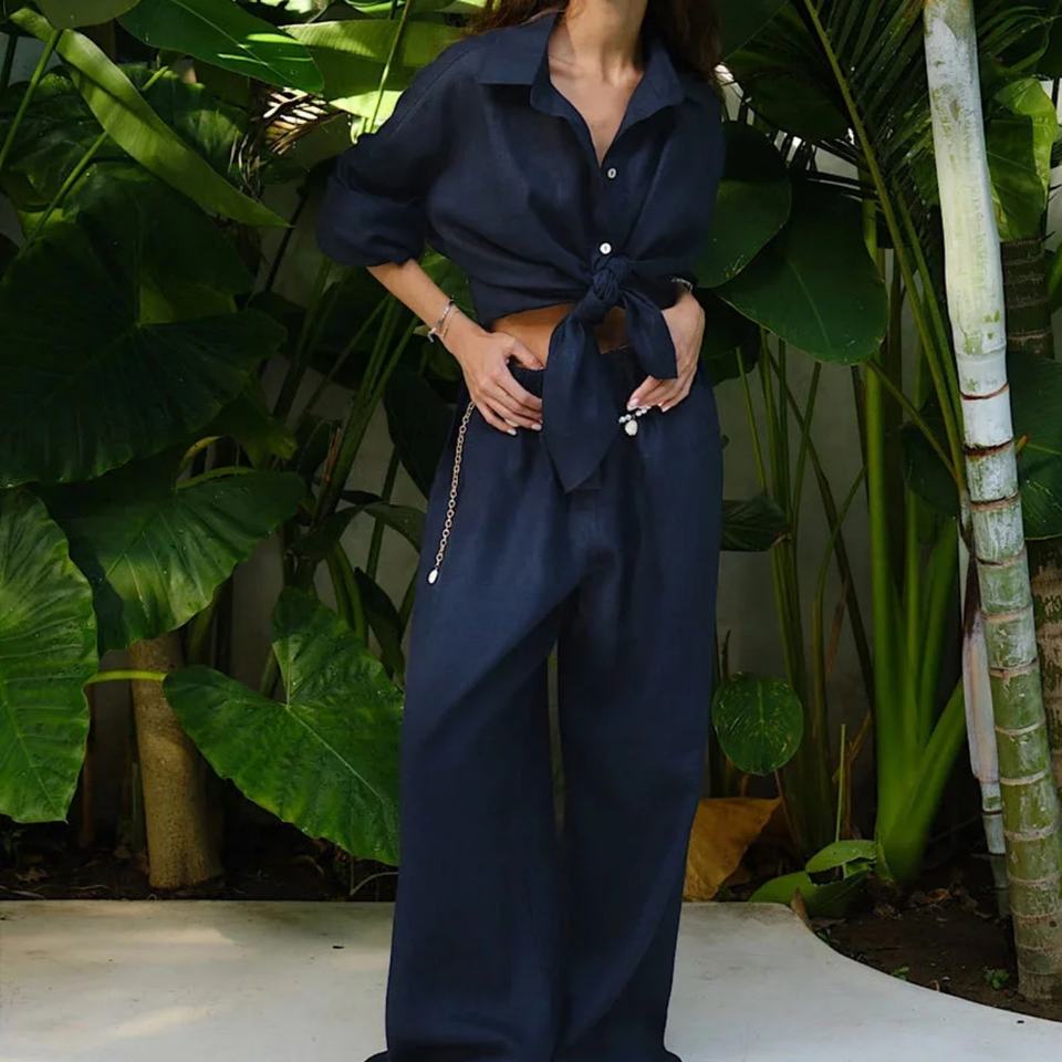 Conjunto de Ropa de Dos Piezas de Lino Transpirable para Mujer, Camisa con Lazos Delanteros y Pantalones Anchos, Estilo Resort