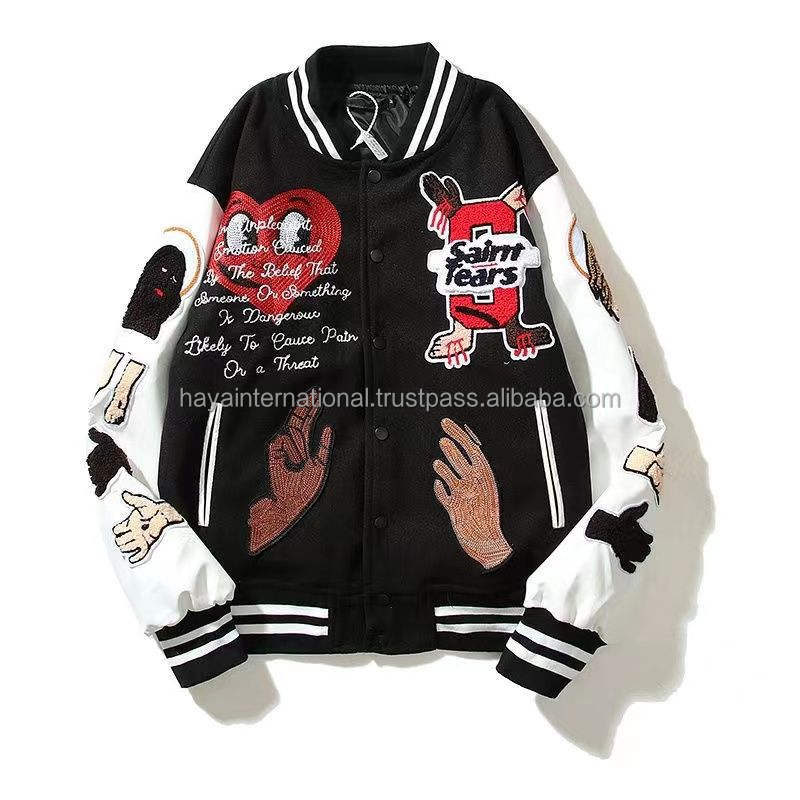 Chaqueta Varsity Unisex de Talla Grande con Cuello Alto, Bordado de Cadena Personalizado Estilo Hip Hop y Parches de Chenille, con Logotipo Frontal, Superventas
