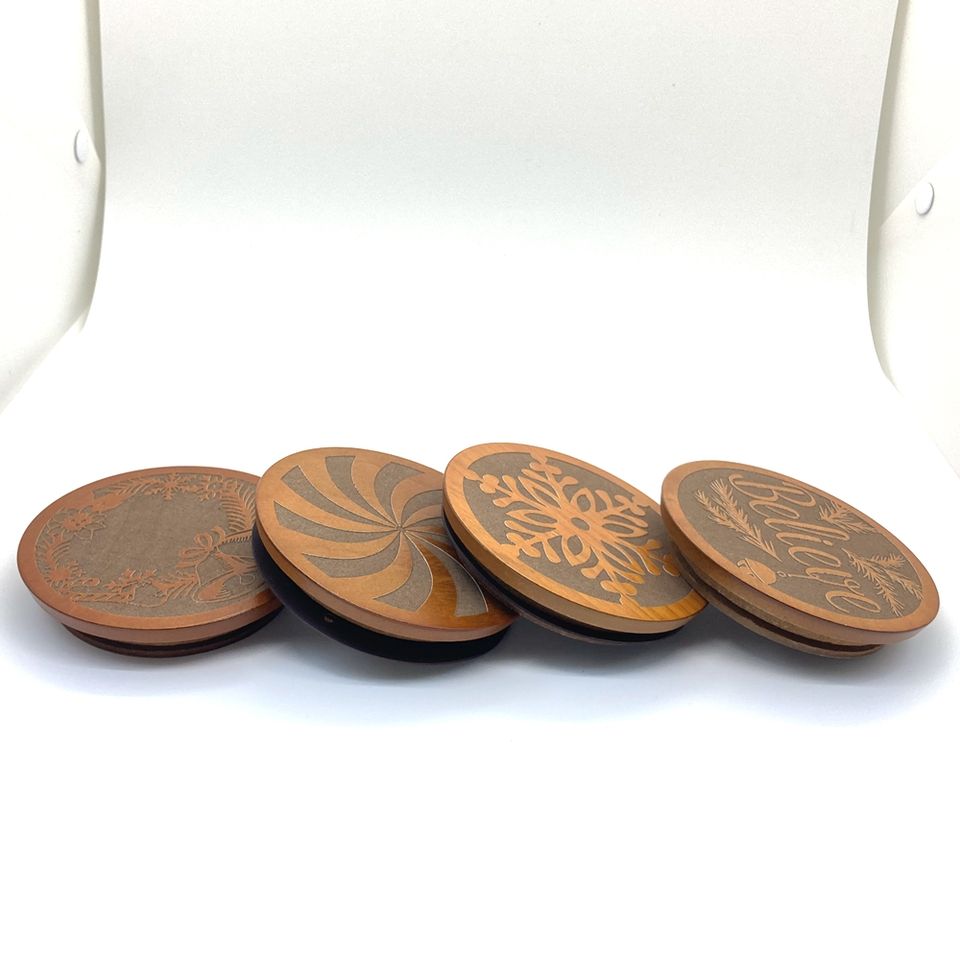 MDF de madera de forma redonda de diseño de lujo más vendido con tapa de chapa de nacimiento para velas de vidrio ámbar 9oz 12oz tarros