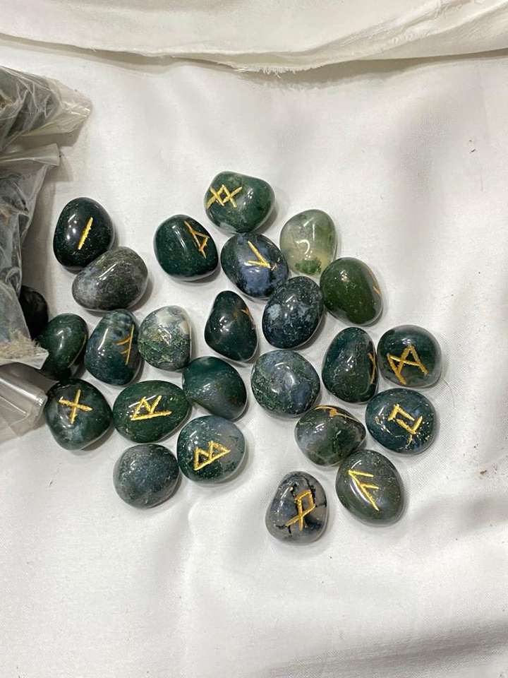 Juego de Runas de ágata de musgo más vendido Piedra preciosa de cristal natural Grabado tallado en técnica de estilo Reiki Artesanías de piedra semipreciosa