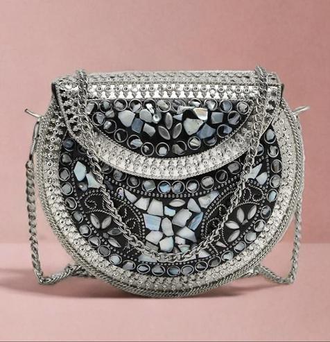 Bolso de mano de metal pulido con incrustaciones de cristal, forma personalizada, de alta gama, para eventos, concursos y ocasiones sofisticadas.
