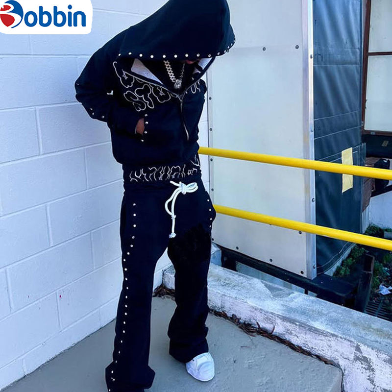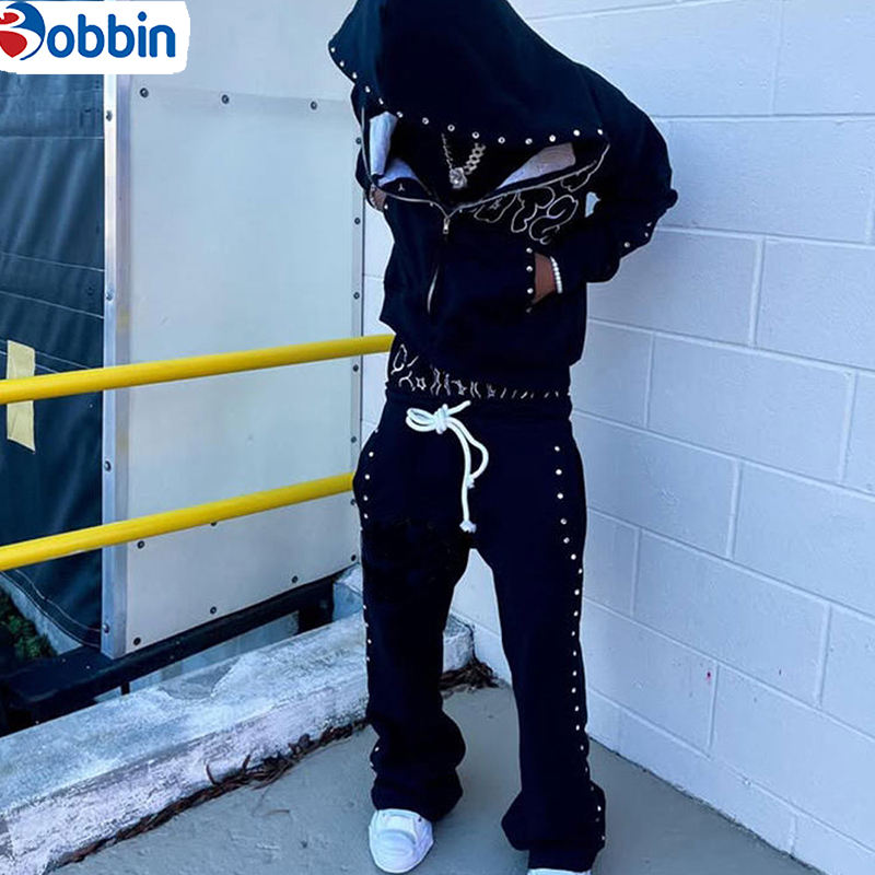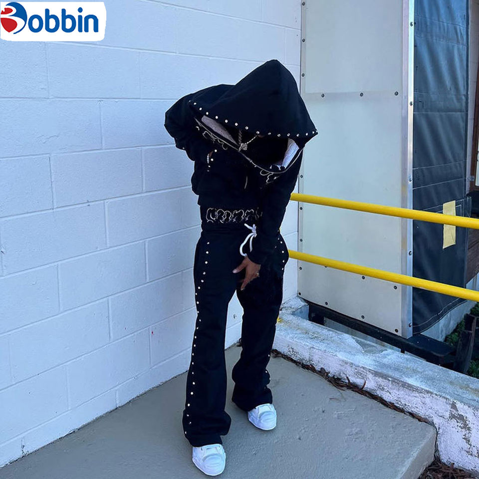 Conjunto Deportivo de Moda con Logotipo Personalizado, Corte Regular, Tejido Grueso 2 en 1, Sudadera con Capucha y Pedrería, Pantalones Deportivos Brillantes para Uso Diario