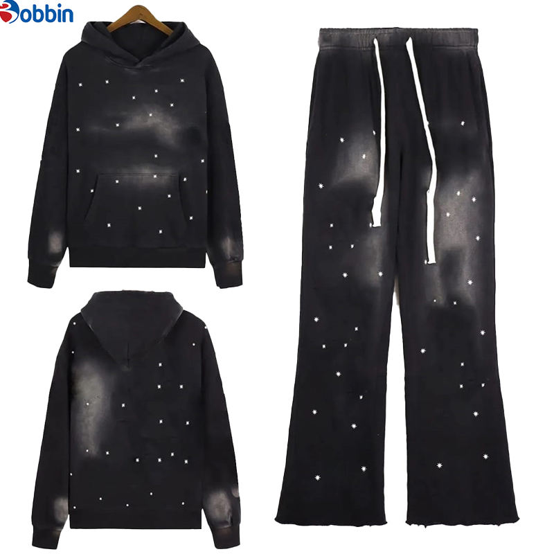 Conjunto de Moda con Pedrería, Sudadera Holgada Unisex y Pantalones con Corte Acampanado, Trajes Deportivos de Algodón con Gemas para Hombre