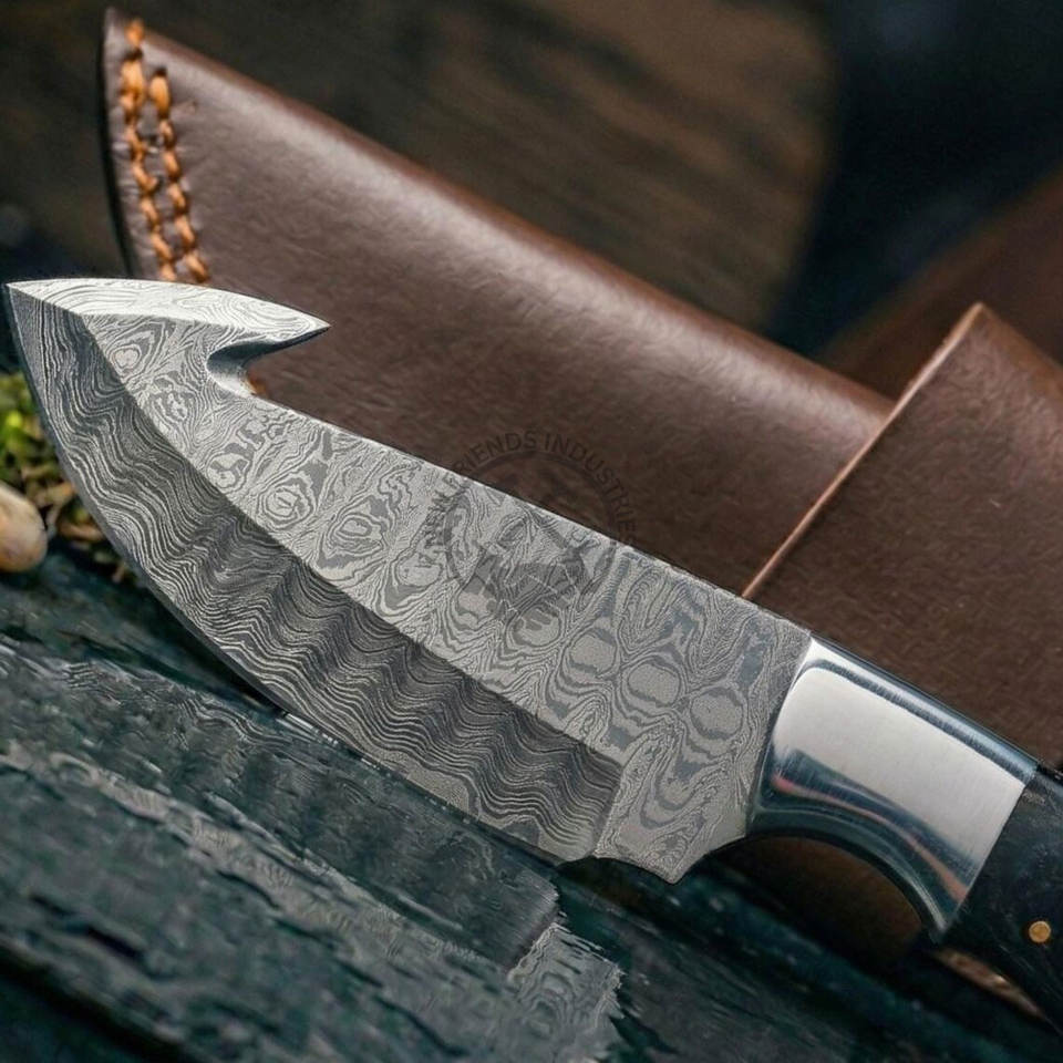 Cuchillo de Caza con Gancho para Intestinos de Acero de Damasco