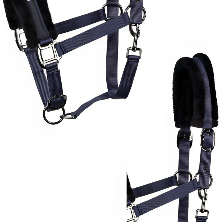 Top Trending Horse Riding Nylon Headcollar acolchado con piel negra, tachuela de caballo ecuestre Piel de oveja acolchada nylon break halters