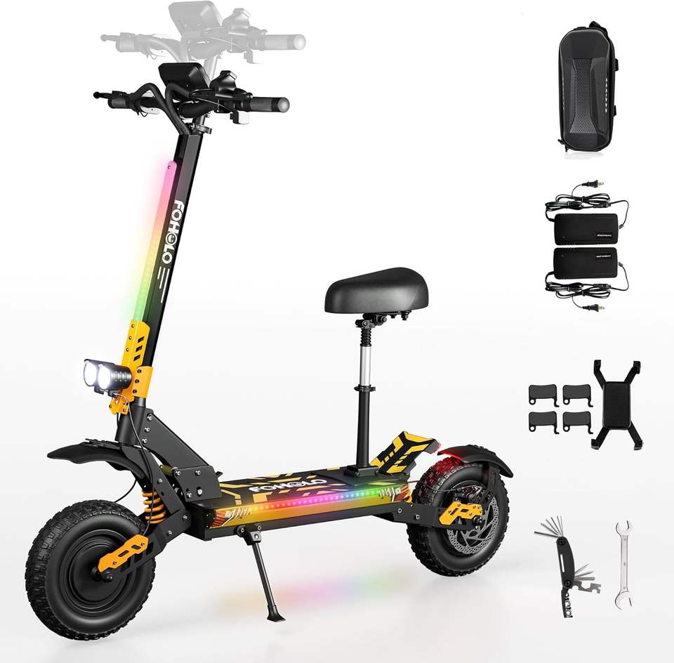 Nuevo Scooter Eléctrico Más Vendido para Adultos, 5000W, Motores Duales, Velocidad Máxima 75 km/h, 60V/21Ah, 88 km de Autonomía, Neumáticos Todoterreno, Plegable con Asiento