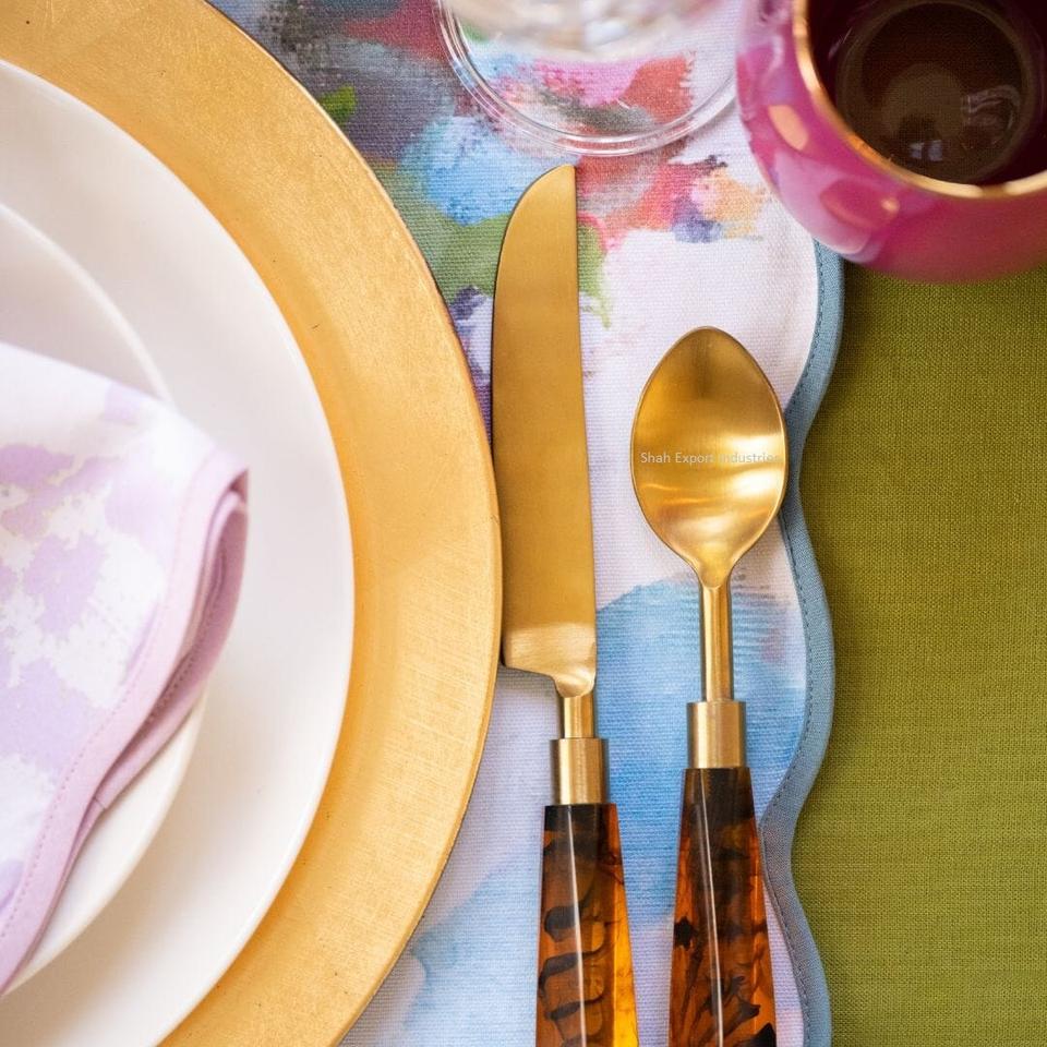 Juego de Cubiertos de Metal con mango acrílico de concha de tortuga, acabado dorado para el hogar, boda, hoteles, cena, Decoración de mesa, juegos de cubiertos