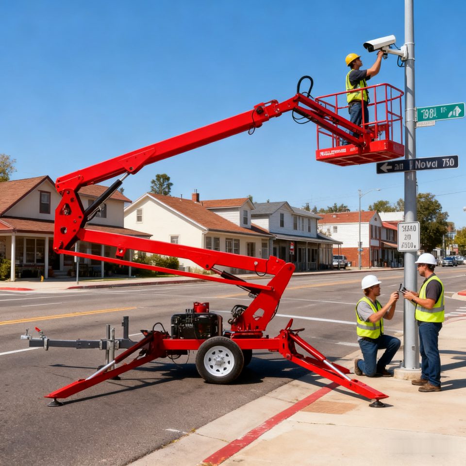 Elevador de pluma remolcable de 16m, plataforma de trabajo aéreo montada en remolque, remolque detrás del recogedor de cerezas, elevador hidráulico para exteriores para construcción