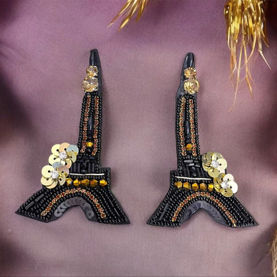 Pendientes de torre, bordado de cuentas de semillas hecho a mano, joyería de diseño de París, accesorios de declaración de cuentas negras, moda personalizada