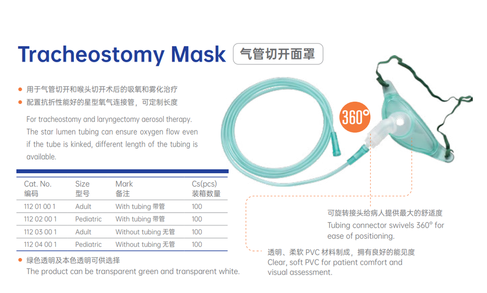 Máscara de traqueotomía Tamaño adulto Máscara de oxígeno de traqueotomía desechable con conector de rotación 360 y tubo traqueal