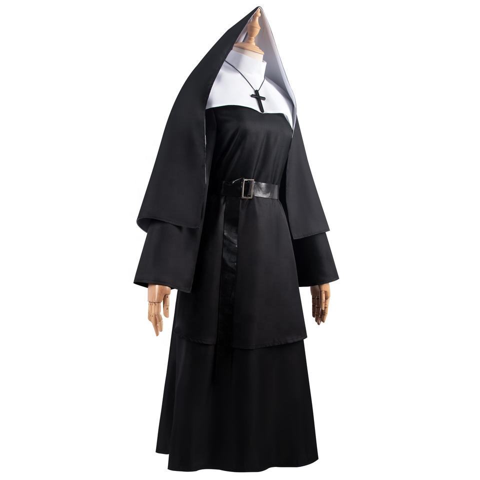 Disfraz de monja negra tradicional con hábito de velo y collar cruzado para Halloween Cosplay Church Roleplay