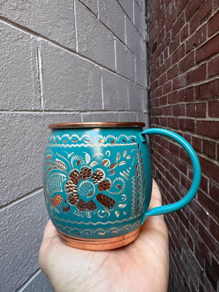 Taza de cobre tradicional hecha a mano para beber agua y bienestar Ayurvédico con acabado impreso elegante