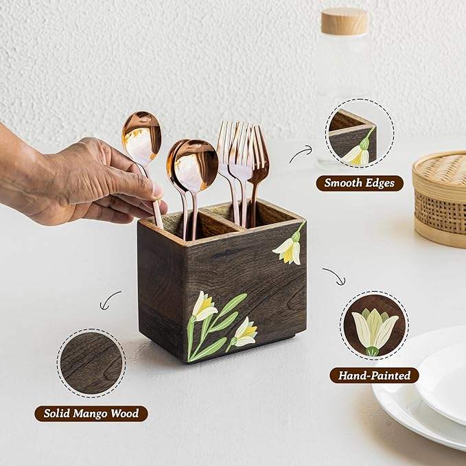 Soporte para Cucharas de Madera Natural con Estampado Tradicional Indio, de Tres Niveles Ajustables, Obra de Arte Clásica para la Cocina del Hogar