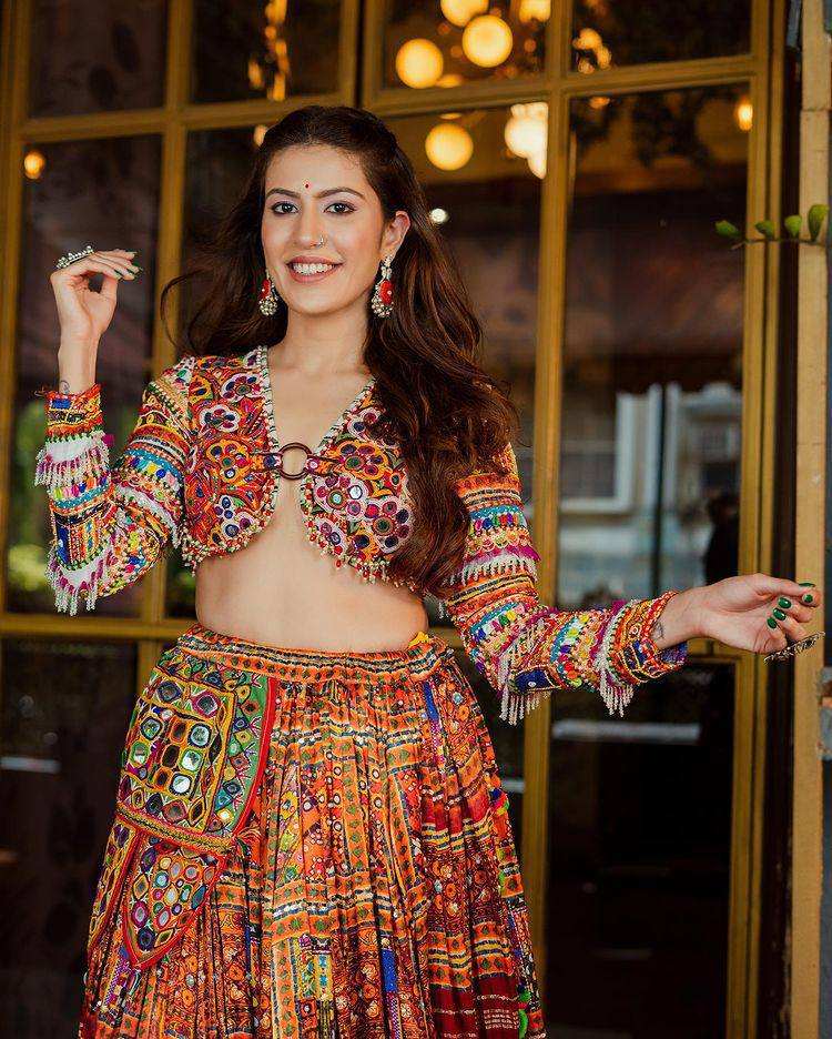 Nombre del producto:Lehenga Choli Dupatta Mantequilla Seda Impresión digital y trabajo de espejo
