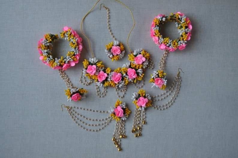 Joyería floral tradicional Mehndi para novia con Collar, pendientes de anillo, pulsera Maang Tikka y rosa