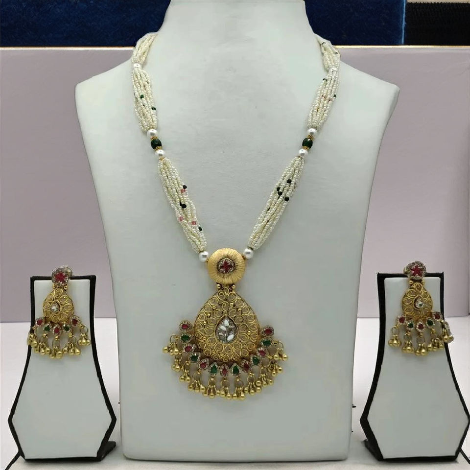 Conjunto de Collar de Perlas Tradicionales de Varias Hebras con Colgante de Filigrana de Oro Antiguo y Pendientes Jhumka a Juego, Joyería Nupcial