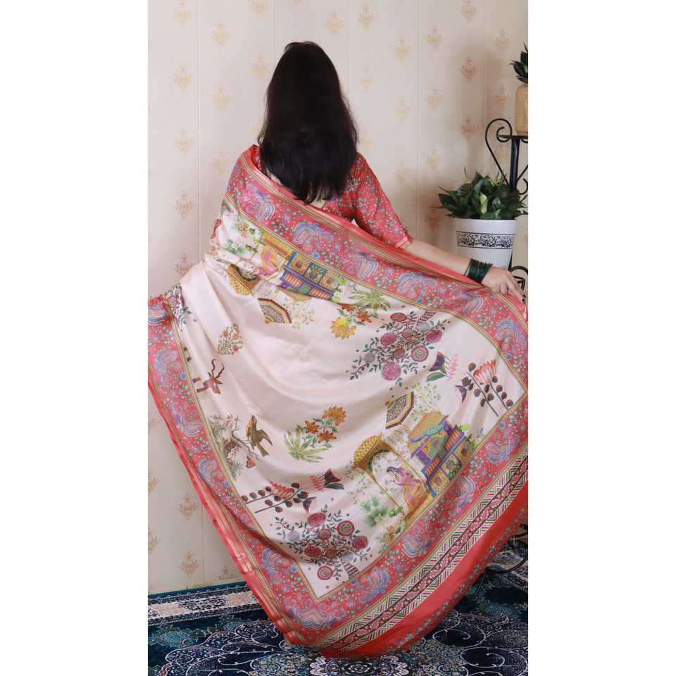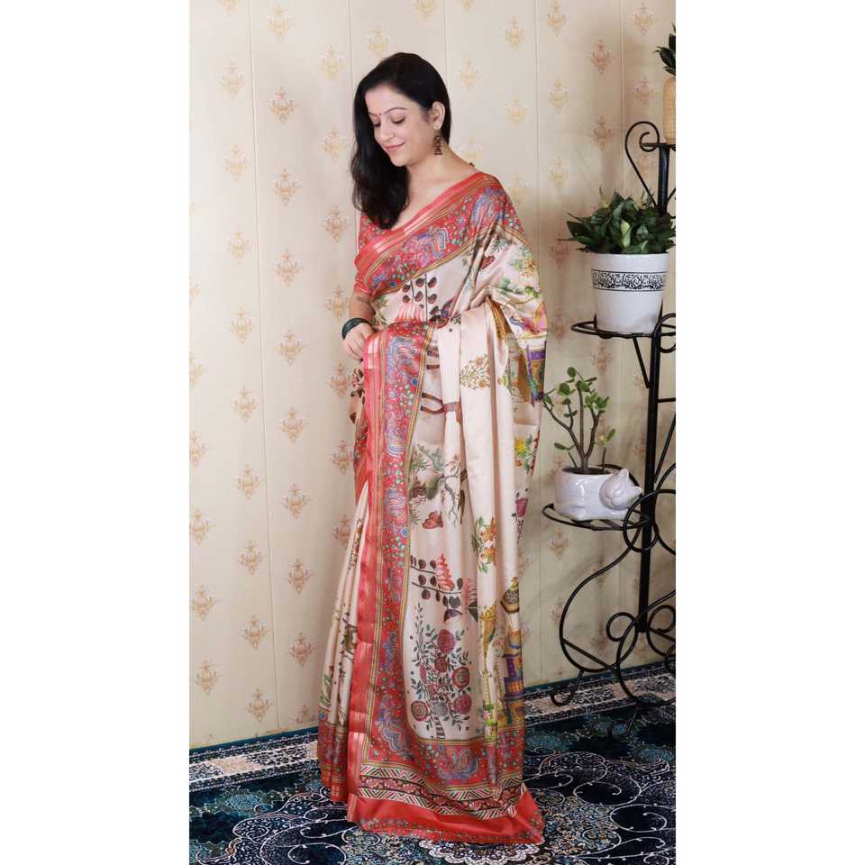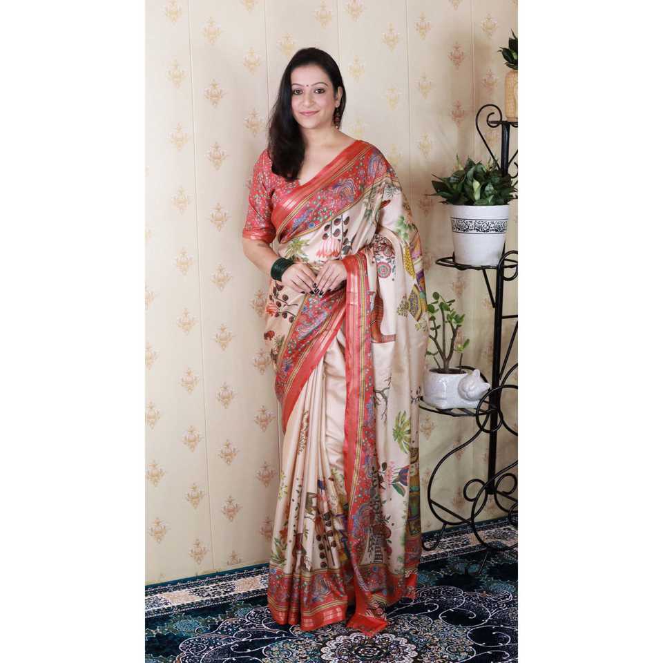 Sari Tradicional Tejido con Zari Estampado, Seda Tussar Roja, Pachititra, Blusas y Camisas para Mujer
