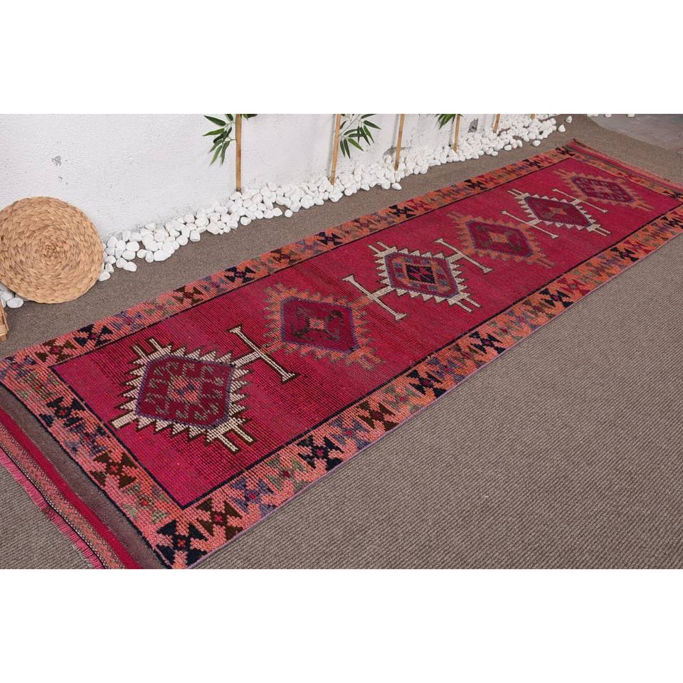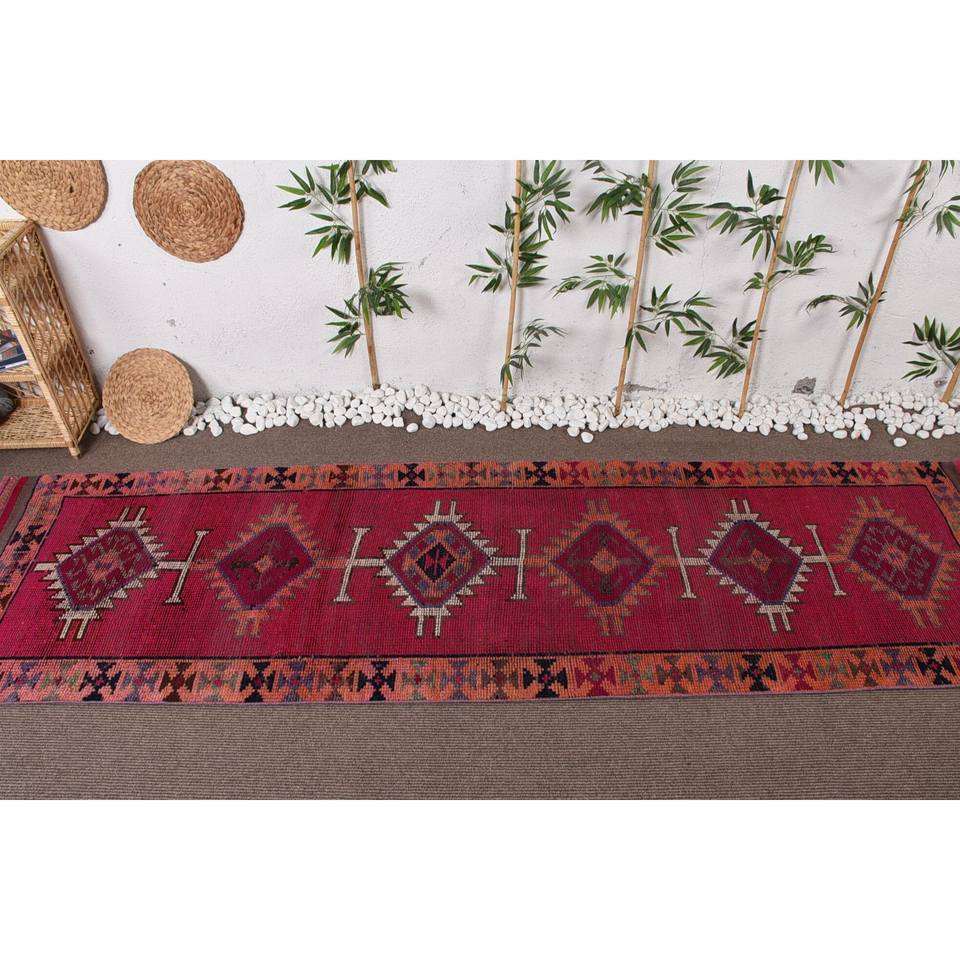 Alfombra tradicional de lana de retazos rojos y naranjas, patrón de pasillo rectangular de 9x12 para entrada o cabecera, respaldo de látex