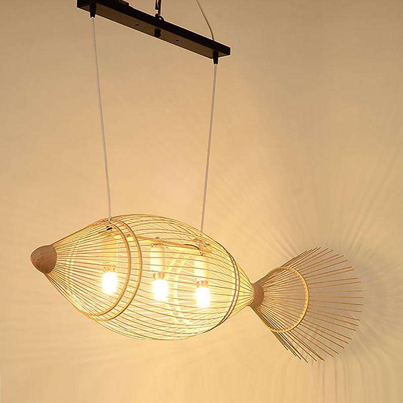 Lámpara de araña de bambú de ratán con forma de pez de estilo tradicional, luces decorativas navideñas únicas para aplicaciones de almacén de techo