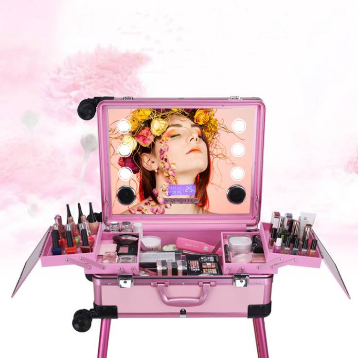 Maleta de Viaje con Luces, Ruedas Omnidireccionales, Organizador de Cosméticos con Ruedas Iluminadas, Carrito Profesional para Artistas de Estudio