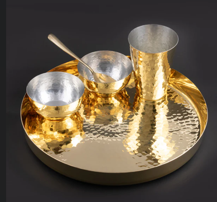 Transforme su experiencia culinaria con nuestro juego de platos de latón, una combinación perfecta de tradición atemporal y elegancia moderna