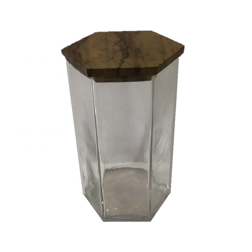 Translúcido de vidrio de lujo hecho a mano de alta calidad de Multi-propósito alto hexagonal mercurio plata vela tarro con Mango tapa de madera