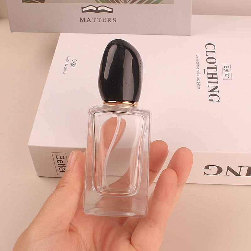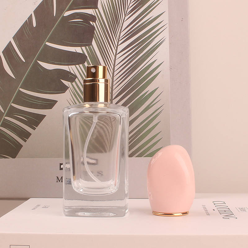 Spray de niebla cuadrado de lujo transparente 50ml Venta al por mayor Botella de perfume de vidrio de regalo vacía Embalaje con tapa rosa y negra