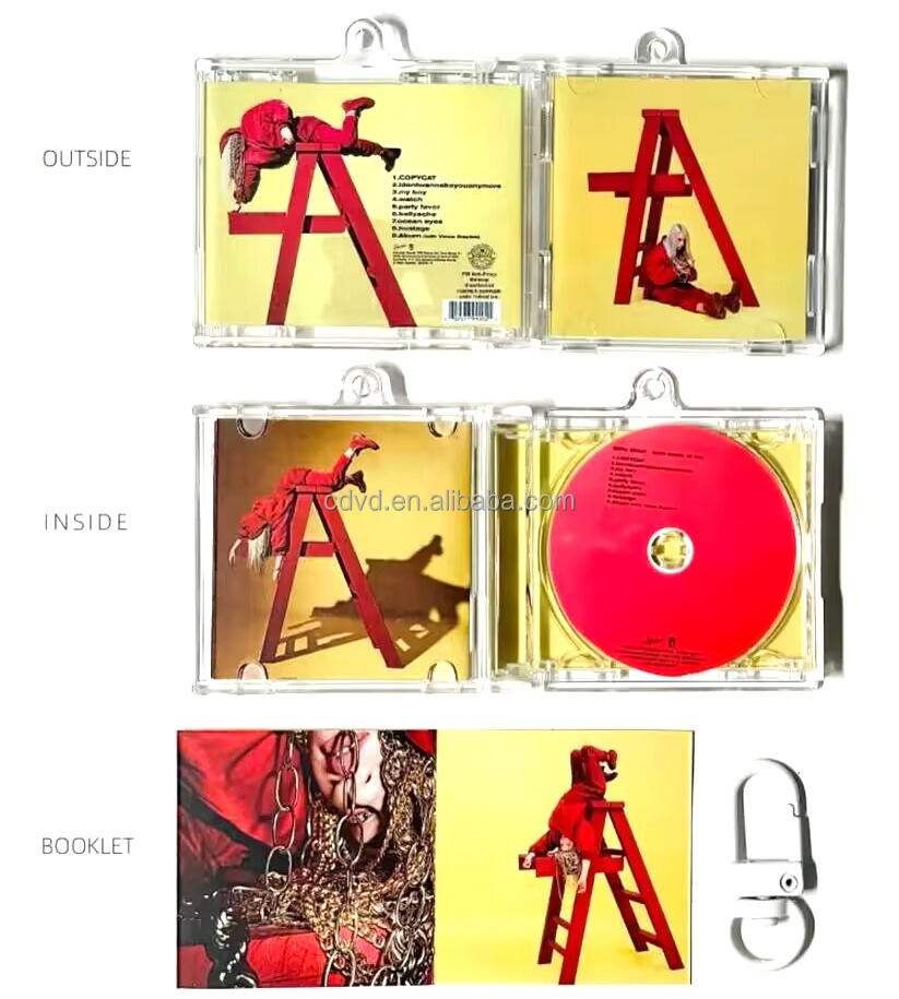 Material:Estuche transparente de PS para CD con gancho, papel insertable y llavero