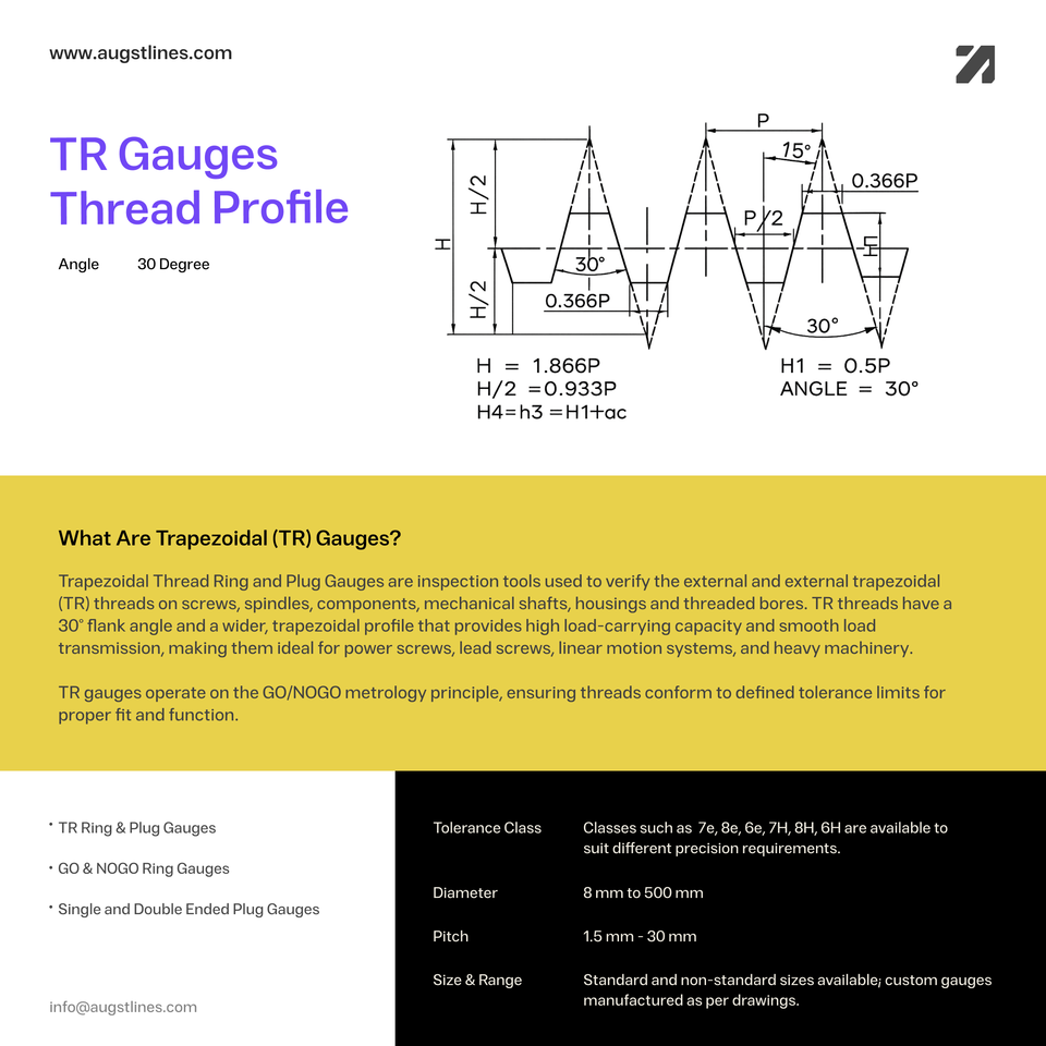 Calibradores de rosca trapezoidal de 30 grados y calibradores de tapón con tolerancia 7E, 8E, 7H, 8H para inspección de roscas externas GO/NOGO AUGST LINES