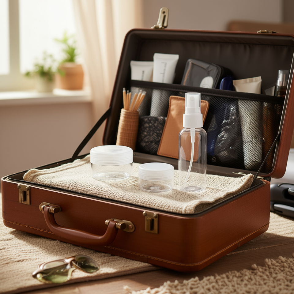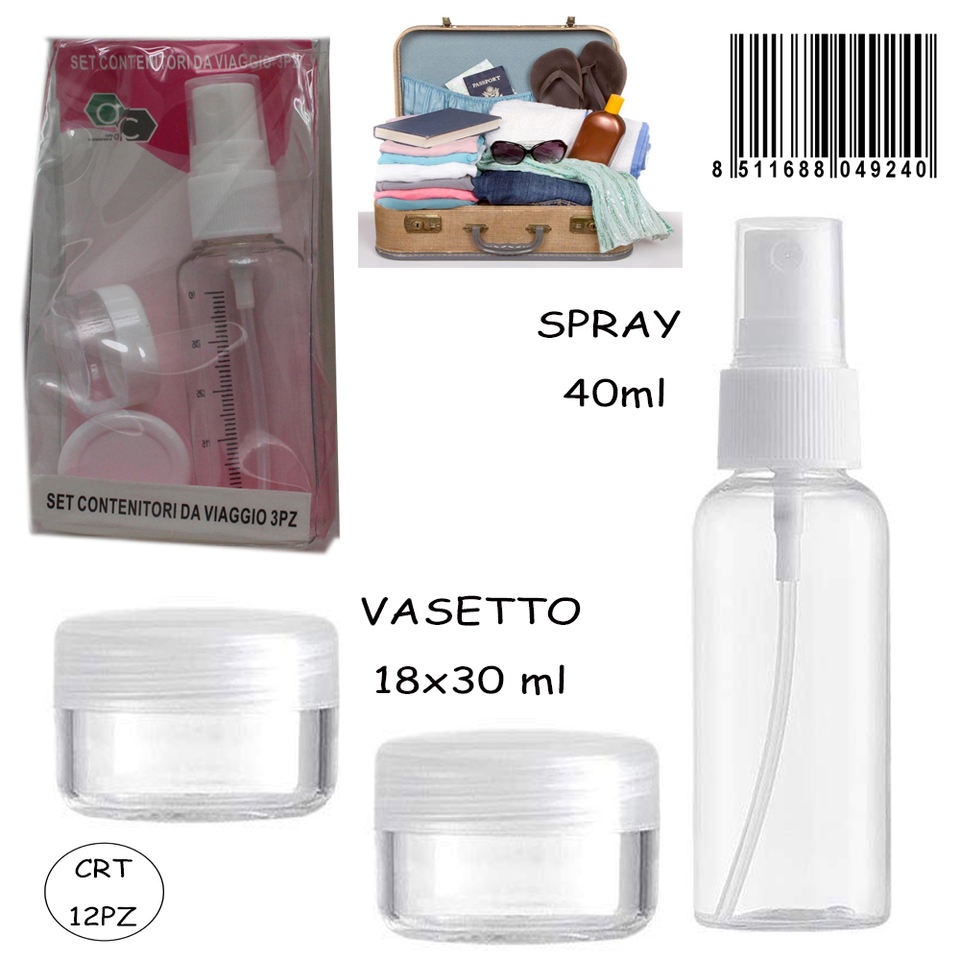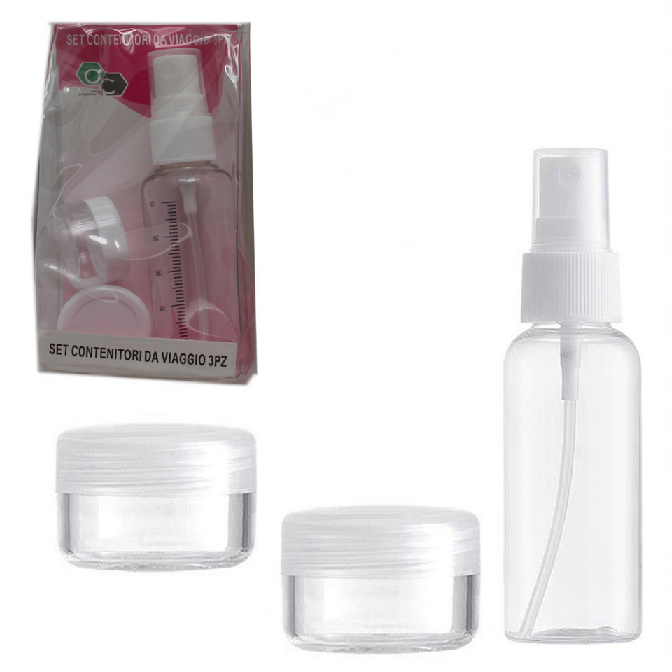 Juego de recipientes de viaje, botella redonda de 3 piezas con pulverizador y frascos para almacenamiento de cosméticos