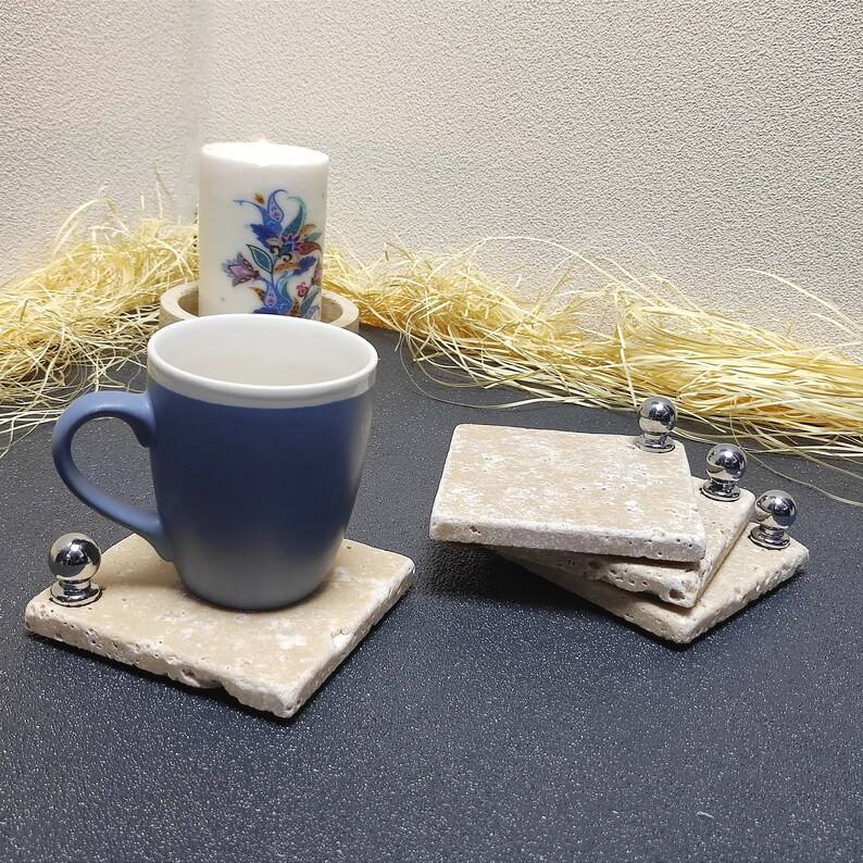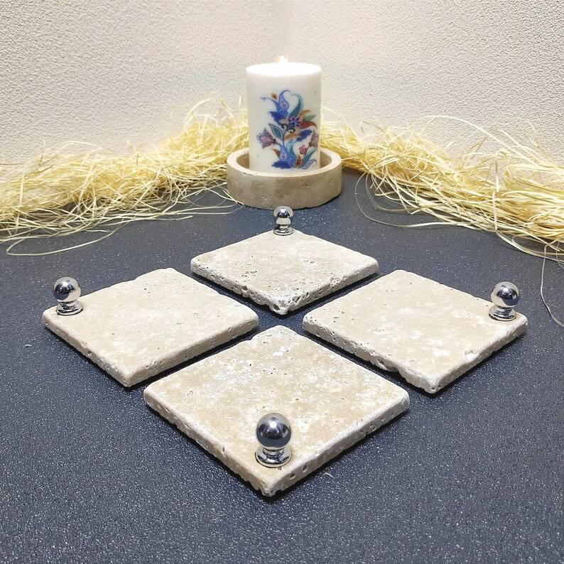 Posavasos de travertino, Juego de 4 posavasos cuadrados de piedra con accesorio de bola plateada, posavasos de té de mármol, decoración moderna para el hogar