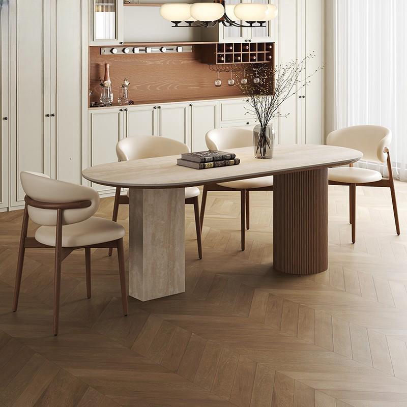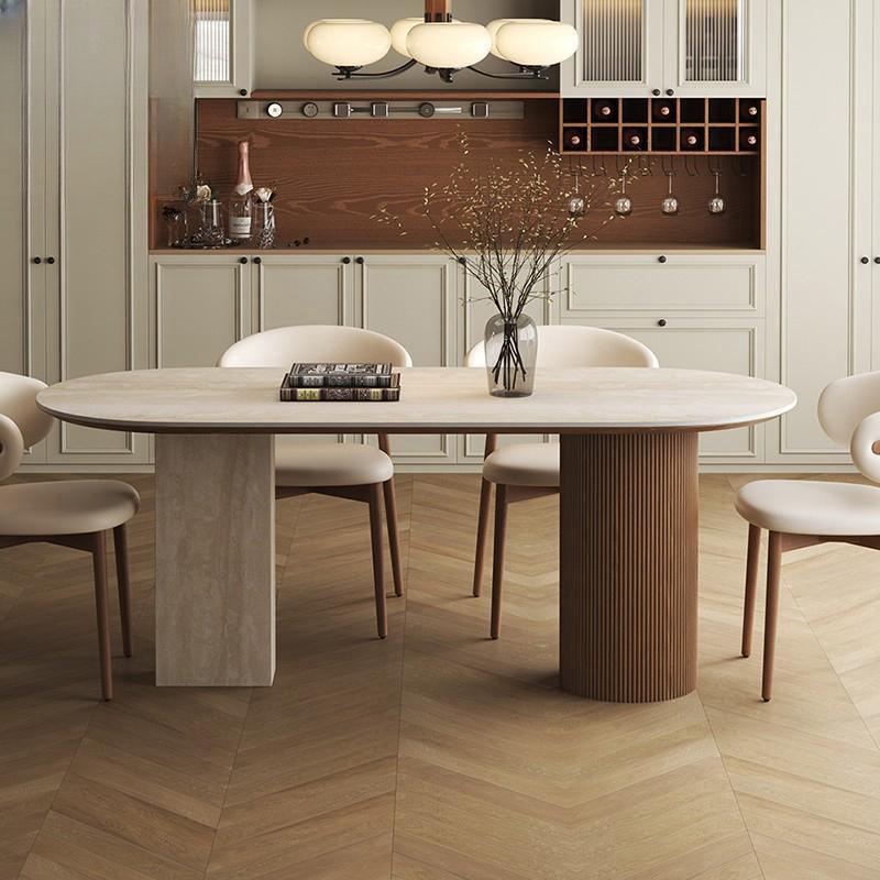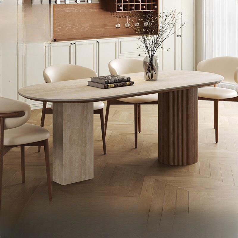 Mesa de comedor ovalada de travertino con patas de columna romana, estructura estable combinada para comedor