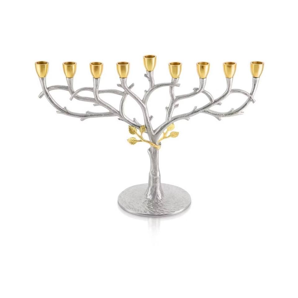 Menorá de Nueve Ramas Plateada y Dorada Estilo Árbol, Candelabro Artístico Judío para Hanukkah, Diseño Inspirado en la Naturaleza