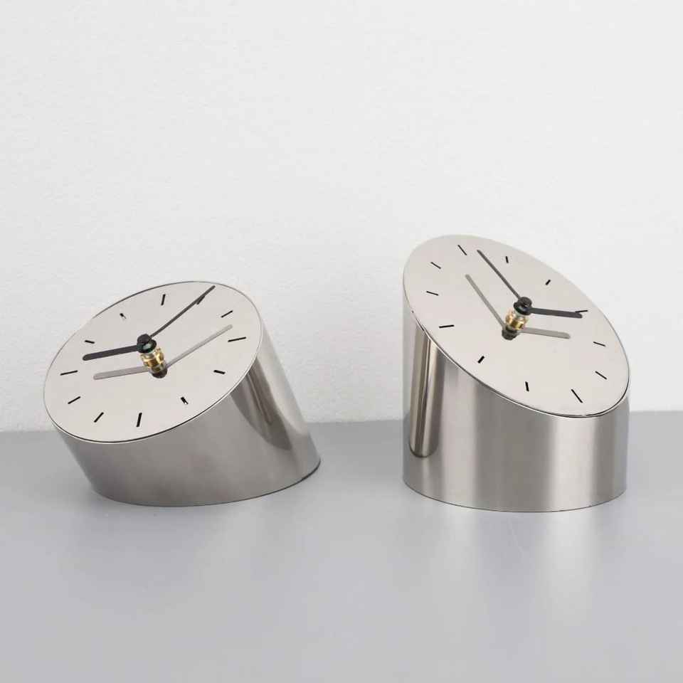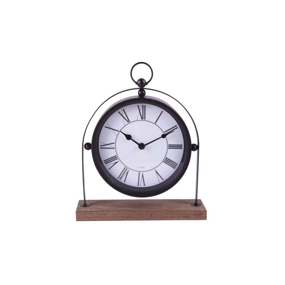 Reloj de Mesa Moderno con Marco de Metal Negro, Esfera Blanca con Números Romanos, Base de Madera, Diseño Arqueado, Minimalista, Clásico y Elegante
