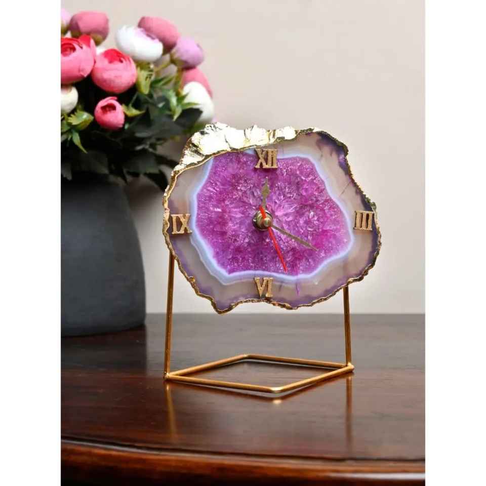 Reloj de Mesa de Piedra Geodésica Marrón Beige de Moda con Números Romanos Dorados, Manecillas Rojas y Doradas, Base Dorada y Cristal Natural