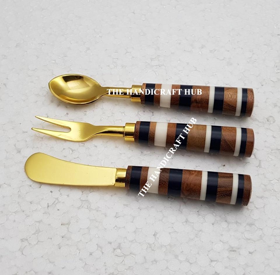 Juego de utensilios de cocina de diseño moderno para queso, juego de cubiertos de acero inoxidable con mango de resina de madera a un precio muy asequible.