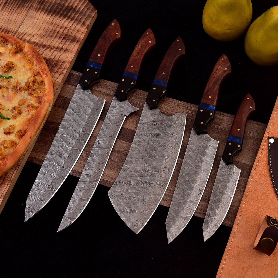 Juego de cuchillos de cocina de estilo nuevo, hechos a mano, con hoja de acero, 5 piezas, con funda de cuero para transportarlos.