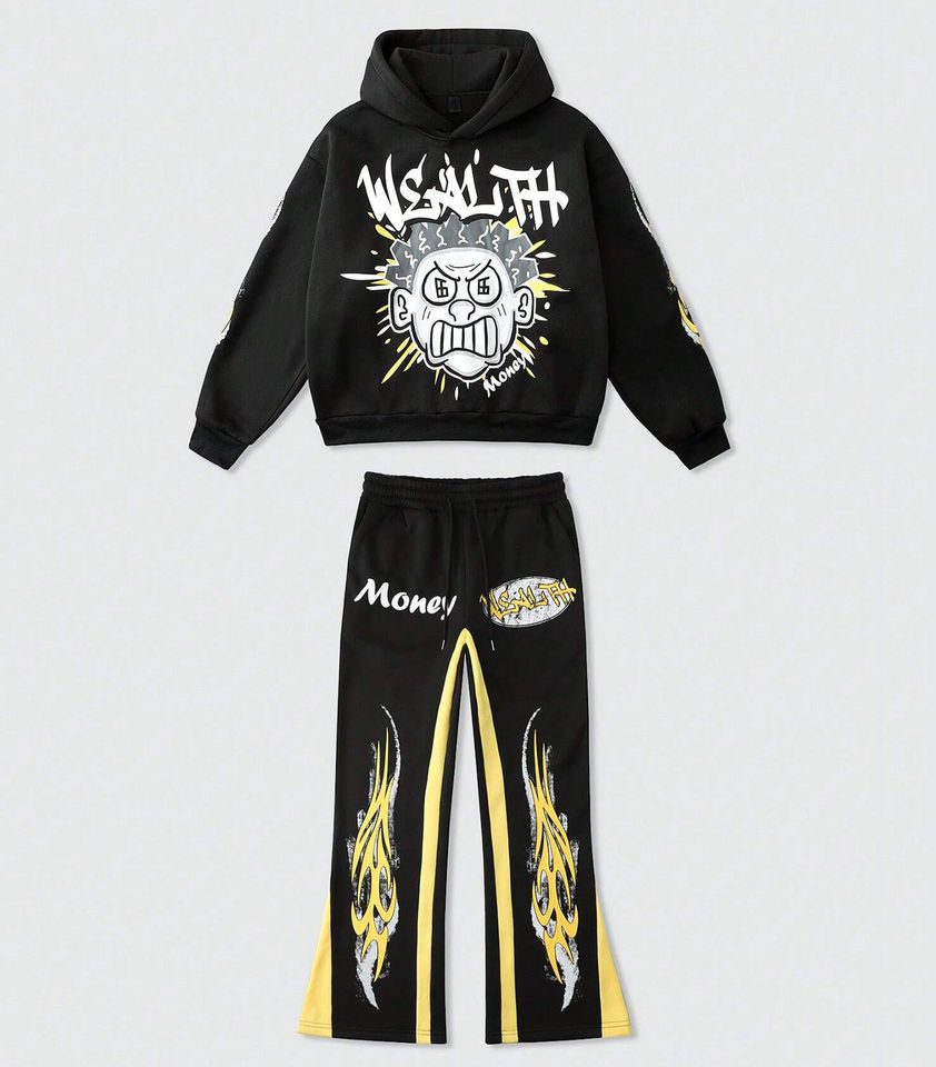 Conjunto de Sudadera con Capucha y Pantalones Deportivos para Hombre, Diseño de Letras y Estrellas Personalizadas, Impresión DTF, Bloques de Color, Cordón Ajustable, 100% Algodón, Estilo Urbano, Tendencia