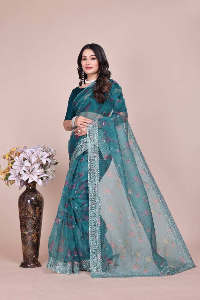 Nueva colección de Sari de impresión Digital con diseño de flores de tendencia con tejido de organza y trabajo de bordado Zari para ropa de mujer