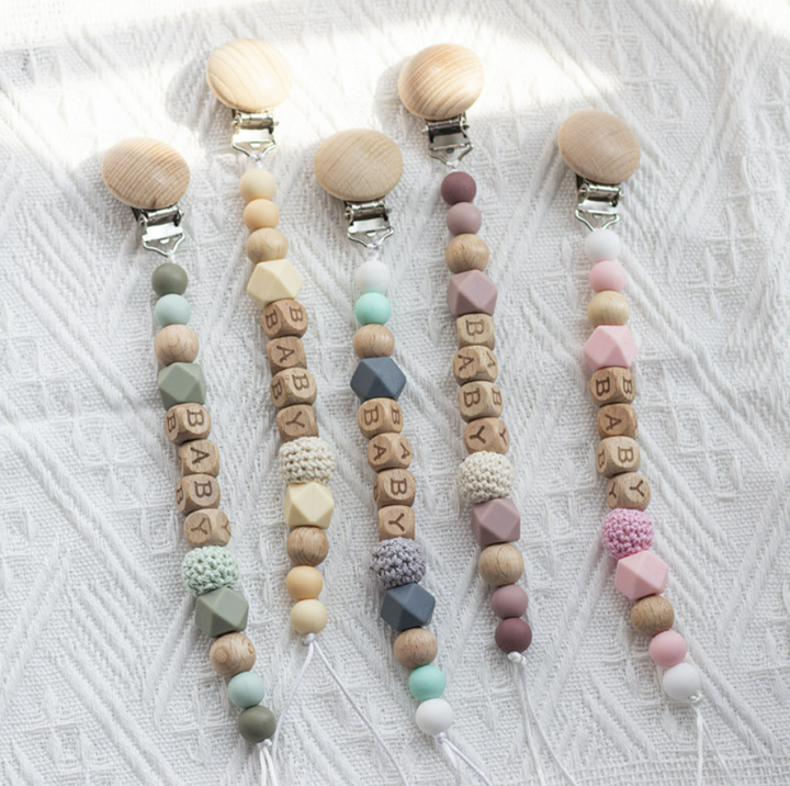 Clip para Chupón de Madera de Haya con Cuentas de Moda, Bola de Ganchillo de Silicona, Soporte para Chupón, Clips para Chupón Personalizados para Bebé, Regalo para Bebé