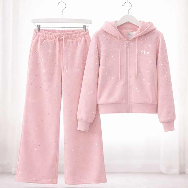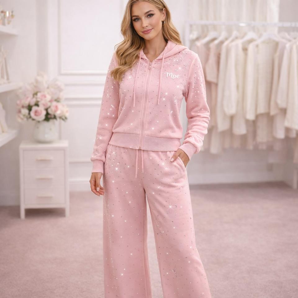Conjunto de dos piezas de chándal rosa de moda con pedrería, transpirable, sudadera con capucha oversize y pantalones acampanados, proveedor OEM personalizado